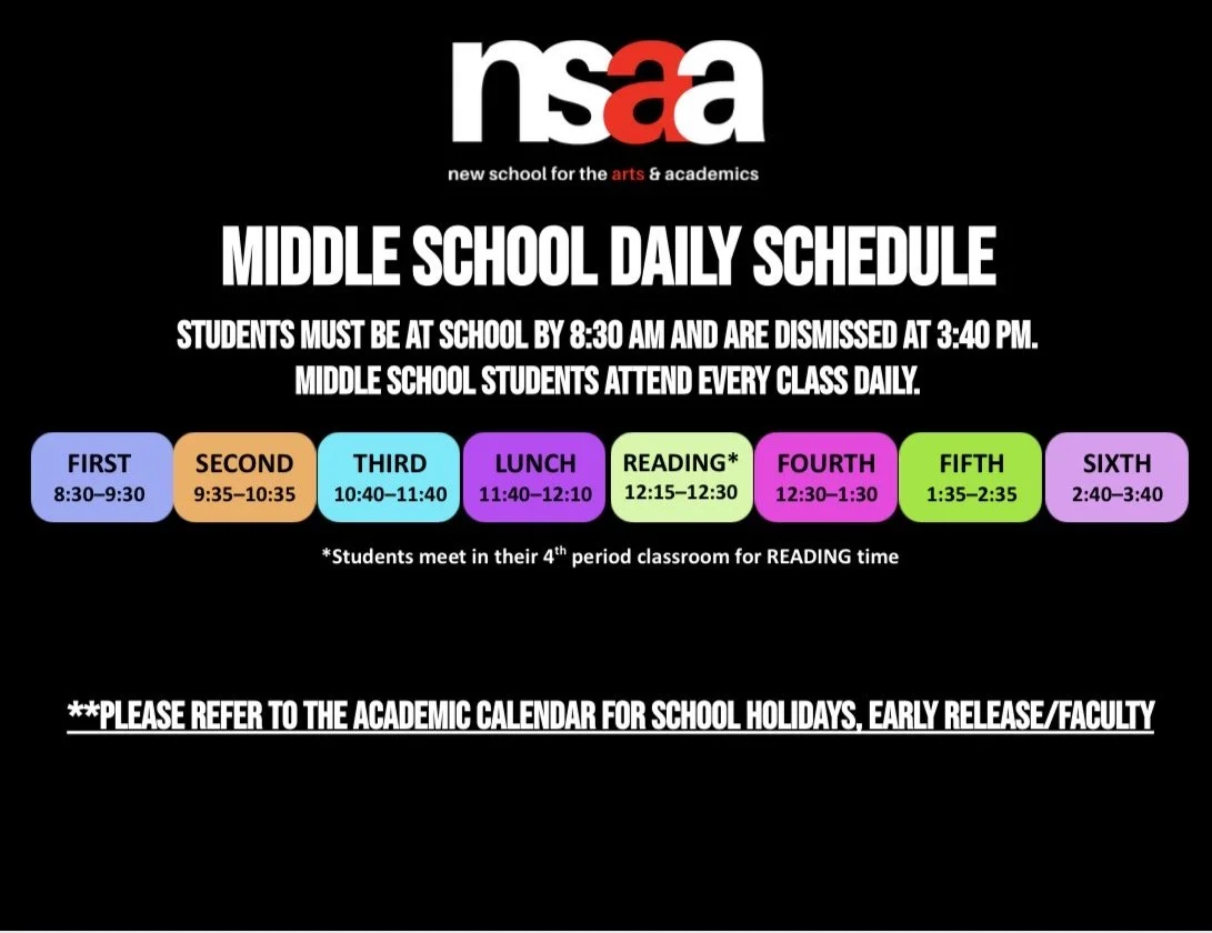 Middle School students have a 15 minute required Sustained Reading Time daily from 12:15-12:30 which occurs within their 4th period class.