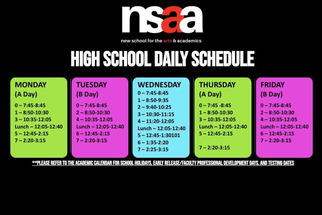 Please see the school calendar for our Wednesday Half Day dates. On these days, HS students are released at 12:05pm and MS Students are released at 11:40am. On Half Days we will use the alternate Wednesday schedule outlined below.